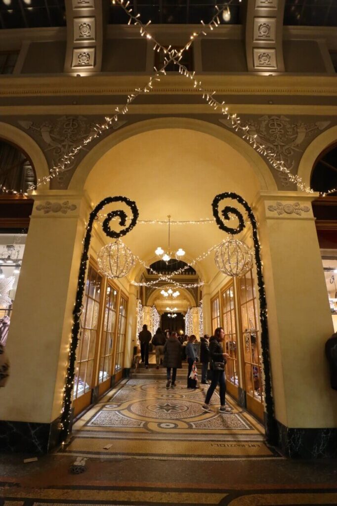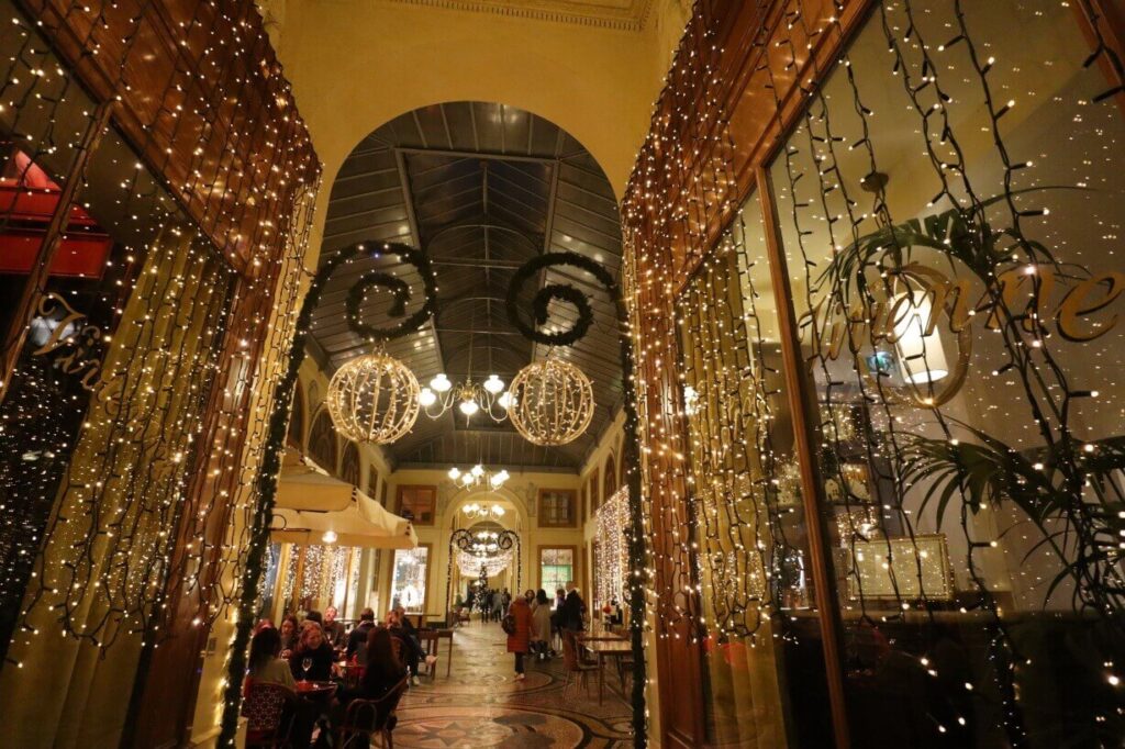 Ya sea en primavera con flores a la entrada, o en invierno con luces festivas y paraguas colgados decorando el cielo de cristal, la Galerie Vivienne es un lugar donde el tiempo parece detenerse.