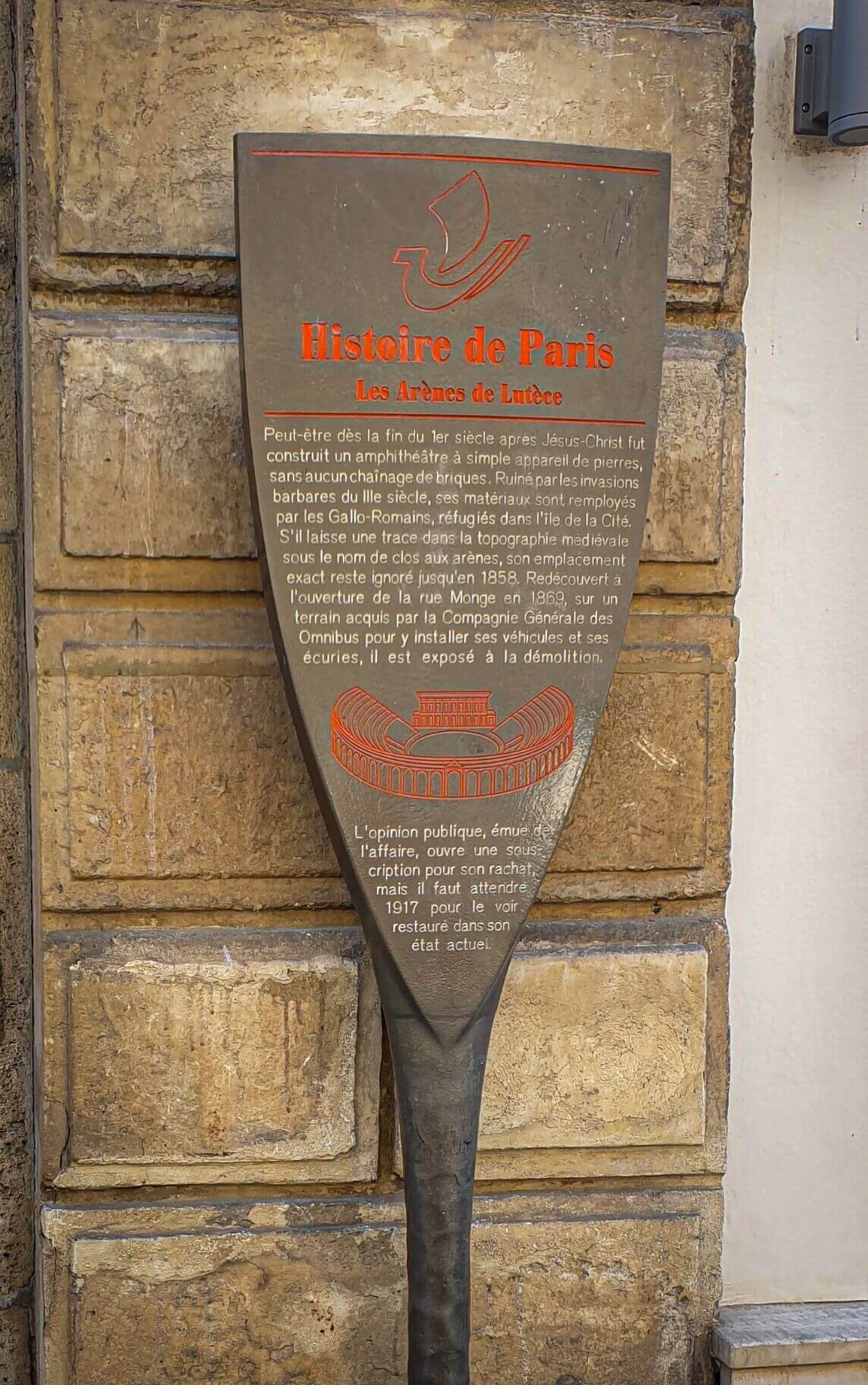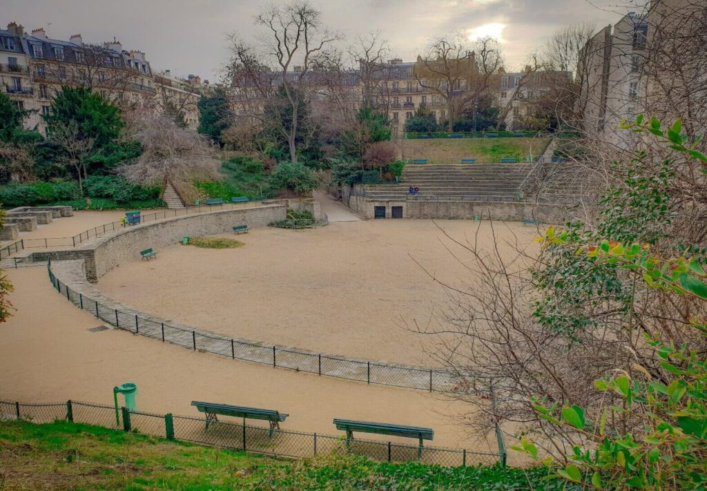 Las arenas probablemente se utilizaron en París desde su construcción hasta la primera destrucción de Lutecia en el siglo III. Sin embargo, estos fueron reparados en el siglo VI por los merovingios para albergar espectáculos. Hoy en día sólo quedan algunas de las arenas, las primeras filas de las gradas (la cávea en latín), el escenario circular, así como los cimientos de las paredes circundantes y los nichos que permitían que el sonido se difundiera por toda la arena. . Estos nichos son las imponentes columnas que ves arriba. Hoy en día, en lo que queda de los enclaves se instalan bancos, como podéis ver abajo a la derecha de la imagen.