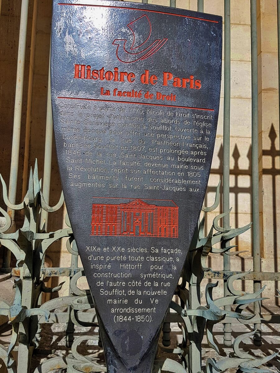 Ubicado en el distrito 5, el Barrio Latino, en la Place du Panthéon, el edificio está en la cima de la Montaña Sainte-Geneviève y forma la cumbre, hay una vista impresionante de la ciudad.