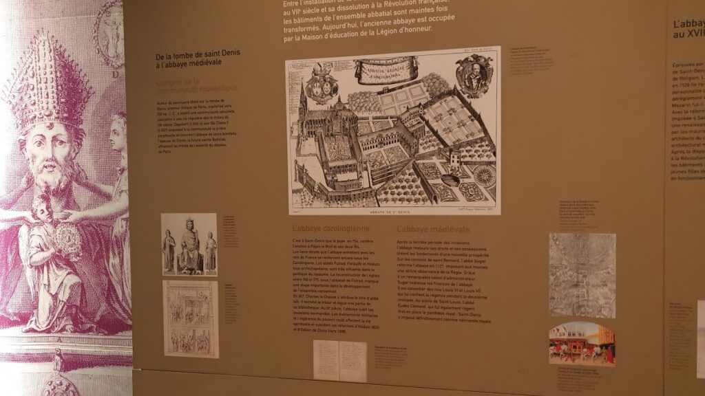 En la colección Vida de santa Genoveva publicada hacia el año 520, el nombre de San Dionisio está vinculado a un mausoleo que se dice que erigió la santa patrona de París. Se dice que Geneviève (nacida alrededor del 420 y muerta alrededor del 500) mostró su devoción al obispo al erigir una iglesia sobre la tumba-santuario dedicada a los tres mártires. En el siglo VI, Dagoberto I, sensible a este lugar de peregrinación, decidió colocar allí su tumba. Al sur de la iglesia, construyó una abadía real a la que concedió la independencia del obispo de París, añadió una feria libre y privilegios fiscales. Los edificios monásticos de este complejo, reconstruido en el siglo XII y luego en el siglo XVIII, albergaron hasta 180 monjes. En 1802.