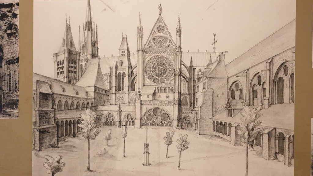 Construida entre 1190 y 1230, la aguja de la torre norte era a principios del siglo XIII la más alta de Ile de France. Luego culmina a 85 metros de altura, 90 metros con la cruz. La torre y su chapitel, restaurados en 1837-38, bajo la égida del arquitecto de los Monumentos Históricos François Debret, fueron gravemente desestabilizados en 1846 por un tornado conocido como “Trombe de Gonesse”, mientras que al mismo tiempo 12 campanarios en el región se están derrumbando. François Debret considera peligroso el debilitamiento de la flecha. En 1847 afin de consolider la tour qui la porte, il décide de la démonter pierre par pierre selon le principe d’anastylose, technique d’archéologie procédant de l’étude méthodique de l’ajustement des différents éléments qui composent l’architecture d’ un edificio. Cada bloque está numerado. Las lecturas lineales del desmontaje son de extrema precisión. El arquitecto proporciona 70 tableros dibujados y un plan de montaje muy definido.